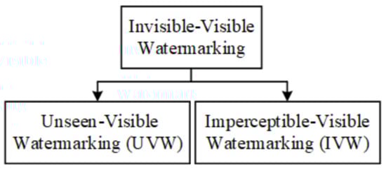 Since the beginning of the digital era and the rise of social media, many digital images and videos have been manipulated and shared without restrictions, control, and protection, creating copyright protection and intellectual propriety problems [1,2,3,4]. As a solution, several visible and invisible digital watermarking algorithms have been proposed mainly for images [5,6,7], video, audio [8,9], and other related fields [10,11,12]. However, in real-world applications such as banknotes, official documents, etc., the watermarks are used to deliver information about its authenticity. In this way, a novel watermarking algorithm named invisible–visible watermarking has been proposed as digital representation of the watermarks in real-world applications; in this algorithm, the imperceptibility, payload, and robustness of the invisible and the visible watermarking algorithms are combined with the high quality, resolution [13,14], and the robust display processing capabilities [14,15,16,17] incorporated into several electronic devices. This new watermarking technology can be classified by its exhibition stage as unseen–visible watermarking (UVW) [18,19,20,21] and imperceptible–visible watermarking (IVW) [22,23,24,25], as shown in Figure 1.