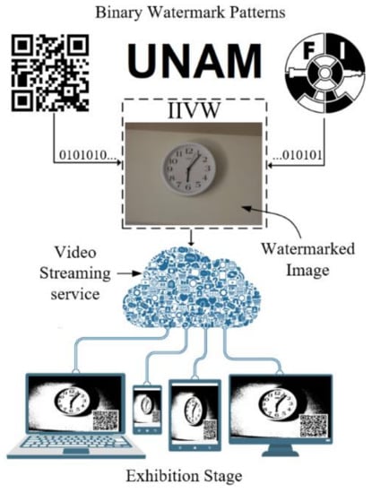 The authors of [24] proposed an improved version of the IVW algorithm [23] that uses a visible watermarking algorithm in the spatial domain and an invisible water-marking algorithm based on the discrete cosine transform (DCT) [28] to embed imperceptibly a binary watermark into a color image Ik. As is shown in Figure 3, once the watermarked image is obtained, it is distributed to the end-users by on-demand or streaming services, and the exhibition stage leverages the processing capabilities of the display devices to exhibit the watermark to the HVS by the mechanism called binarization function.