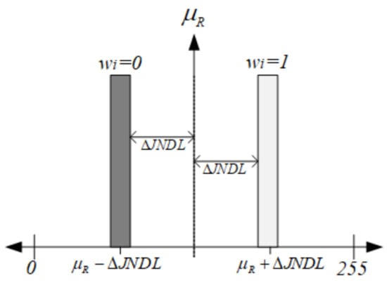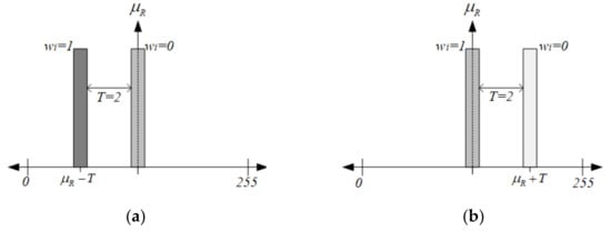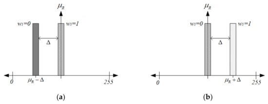 where Rw(pi) corresponds to the i-th pixel of the watermarked region and Δ = round(JNDL(µR)) represents the embedding strength based on the JNDL with respect to the optimal mean value µR. According to the embedding strategy given by Equations (13) and (14), the histogram of the watermarked region is modified as shown in Figure 7, ensuring the same distortion as that of the algorithms reported previously [23,24]. In both embedding strategies, the bits wi = 0 and wi = 1 of the binary watermark are embedded imperceptibly into the pixels with low and high intensity respectively, and with respect to the optimal mean value µR. In Equation (13), the pixels with low intensity are far from the optimal mean value in −Δ, as is shown in Figure 7a; whereas in Equation (14), the pixels with high intensity are far from the mean value in +Δ, as is shown in Figure 7b.