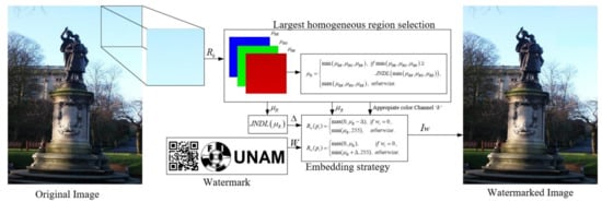 - Appropriate color channel selection. Once the largest homogeneous region R is obtained, an appropriate color channel is selected to embed the corresponding watermark W. According to the previously mentioned, the mean values of each color channel of the embedding region in an RGB color model (µRR, µRG, and µRB) are obtained by Equation (10), and the appropriate color channel must satisfy Equation (11); for example, if the optimal mean value is satisfied by µR = µRG, in which µRG is the minimum or maximum mean value, the appropriate color channel corresponds to the green one.