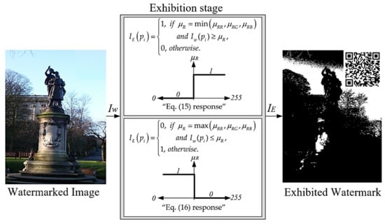 The UVW algorithms [18,19,20,21] embed imperceptibly a watermark pattern through a visible watermarking strategy and take advantage of the image enhancement functions provided by the display devices, such as brightness, contrast, gamma, etc. [26,27], to exhibit without additional computational algorithms the watermark to the human visual system (HVS). The IVW algorithms [22,23,24,25] have been proposed as a solution to the several drawbacks presented in the exhibition stage of the UVW algorithms, where a QR code as a watermark is exhibited to the HVS in gray-color, which reduces its readability and the capacity to be correct decoded by common applications. Considering the mentioned drawbacks, the authors of [23] present a pioneer IVW algorithm that takes advantage of the processing capabilities incorporated into the capture devices to embed and exhibit a QR code as a watermark. This algorithm addresses and improves the drawbacks presented by the UVW algorithms; however, its applicability is restricted to professional capture devices with high storage memory and histogram modulation functions, and the exhibited watermark is shown to the HVS in color, which limits its reading and the information decoding by applications with the ability to read QR codes in color. Conversely, an improved IVW algorithm is presented in [24] that solves the above-mentioned drawbacks. To achieve this, a visible watermarking algorithm in the spatial domain is used to embed a QR code into a color image, and an invisible watermarking algorithm in the frequency domain [28] is used to embed the crucial parameters of the embedding stage. In the exhibition stage, the algorithm takes advantage of the processing capabilities of the electronics devices to exhibit the watermark pattern through a strategy named binarization function.