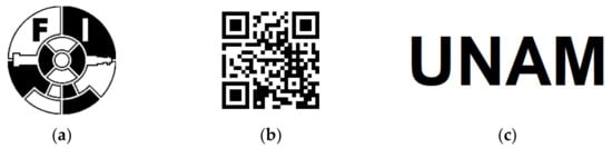 The dataset used to evaluate the performance of the proposed algorithm is obtained from the uncompressed color image dataset (UCID) [36], which contains 1338 uncompressed color images with 512 × 384 size and TIFF format. As shown in Figure 9, three binary watermark patterns are used for the performance evaluation, where Figure 9a,c are two owner logotypes with sizes of 150 × 150 and 134 × 39, respectively. Figure 9b corresponds to a QR code of 116 × 116 size and error correction label L that corresponds to a 7% of loss information; additionally, to specifically evaluate QR codes, error correction levels M, Q, and H are capable of information decoding with 15%, 25%, and 30% of loss information [37], respectively.