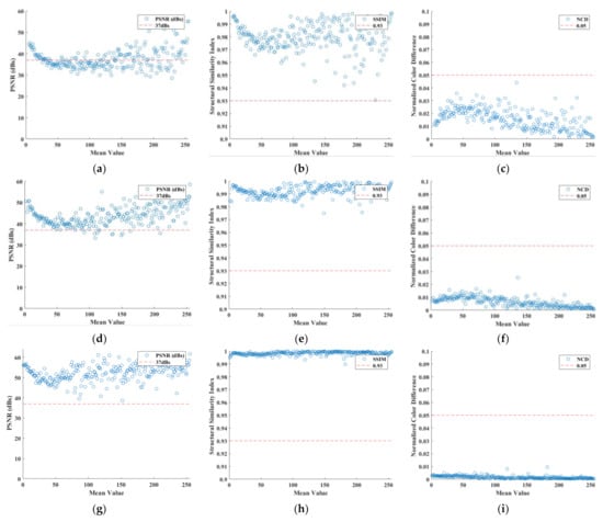 Watermarked UCID graphical quality degradation and imperceptibility. (a–c) are the corresponding PSNR, SSIM, and NCD for the FI watermark; (d–f) are the corresponding PSNR, SSIM, and NCD for the QR watermark; (g–i) are the corresponding PSNR, SSIM, and NCD for the UNAM watermark.