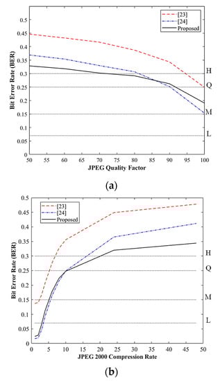 Figure 11a,b shows a BER comparison of the exhibited QR watermark after compression by JPEG and JPEG 2000, respectively; in both images L, M, Q, and H correspond to the QR error correction level.