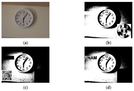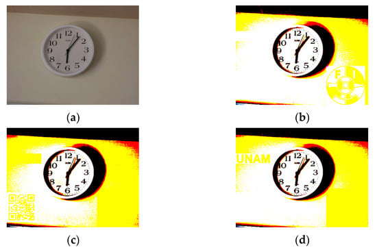 To improve the previously reported algorithm [23], the proposed algorithm takes advantage of the histogram distortion induced by the embedding strategy. The obtained results show that the proposed algorithm has better performance than the most sophisticated and recent algorithm [24]. These results are obtained considering that the embedding region is selected as the largest homogeneous region satisfying the minimum variance; however, in a real-world scenario, the captured scenes can integrate many homogeneous regions that make it possible to embed multiple watermarks. Figure 12a shows an image that once analyzed chooses three non-overlapping regions to embed the proposed watermarks; Figure 12b–d show the corresponding exhibited watermarks.