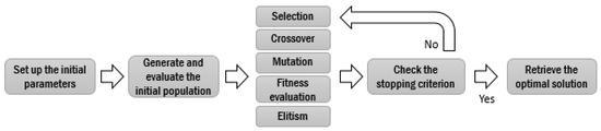The literature lists various procedures for the selection and crossover operators [44] that must be chosen according to the specificities of the solved problem. To improve convergence, elitism techniques can be used to propagate the best-known solution from the current generation to the next. The basic flowchart of the GA is presented in Figure 1.