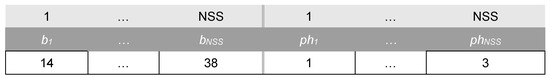 As stated in Section 3.2, the goal of the ESMRG algorithm is to find the optimal bus and phase of connection for a given number of storage devices with the aim of minimizing the active energy losses. For that purpose, the structure of the chromosome was chosen in such a way as to encode in a straightforward manner the principle illustrated by Expression (1). Thus, the individuals used by the GA use the structure from Figure 2. The chromosome is divided in two parts of equal length. The first part encodes the buses, while the analogue elements from the second part specify the phases of connection for each battery installed in the EDN. The chromosome from Figure 2 can be decrypted as follows: there are NSS batteries in the network; a battery will be placed in bus 14, in phase a; and another in bus 38, in phase c.