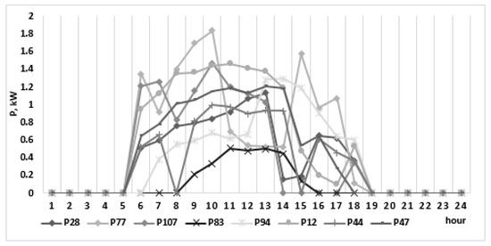 In the network, there are eight active prosumer buses depicted in black in Figure 4 that use PV panels and generate electricity during daytime in the 06:00–18:00 h interval. The electricity not used for local consumption constitutes the surplus that can be injected back in the grid or stored in batteries for later use, if storage capabilities exist. This surplus is represented, for each prosumer, in Figure 5.