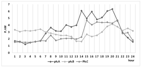 On the other hand, the charge and discharge of the batteries influence the power demand from the grid at the buses where the batteries are located. For reference, the aggregated hourly consumption in each phase is presented in Figure 6, which shows that the load is highly unbalanced, with phase b having the lowest loading. With an optimal placement, the batteries can be used to balance the load and reduce the active energy losses in the network.