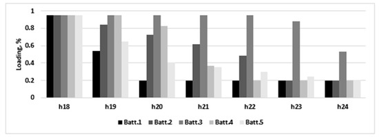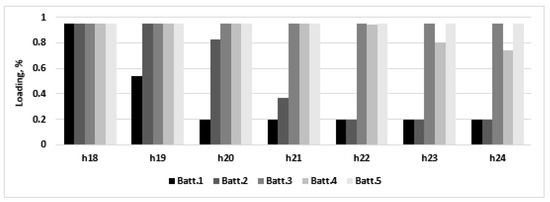 For this scenario, an interesting fact occurred. The algorithm chose bus 85 for installation, which is located near the far end of the network and has the highest demand in the interval of discharge 18:01–24:00 (6.81 kWh). For this case, taking into account the imposed min 20%–max 95% charging limits, a maximum of three batteries can be discharged in bus 85, which were placed by the algorithm in phase a, where the entire bus consumption is measured. Two batteries will be discharged down to the lowest limit of 20%; one will be discharged partially, while the remaining two will not be used at all, as presented in Figure 8. For reference purposes, this figure also contains the battery loading level an hour before the discharging begins.
