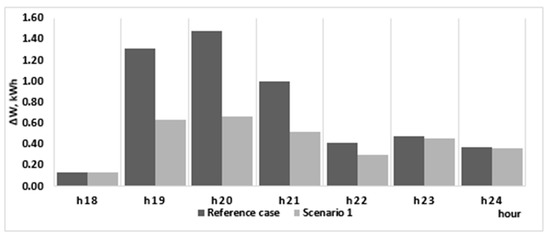 The total hourly load from Figure 6 will change starting from 18:01 only in phase a, resulting in a more balanced operation of the network at peak load hours. Consequently, the energy losses saw an important reduction from 8.74 kWh in the reference case to 6.63 kWh. This reduction of 2.11 kW was concentrated in the (18:01–24:00) interval, as depicted in Figure 9 and was the highest in the peak interval 18.01–20.00 (h19 and h20 from Figure 8).
