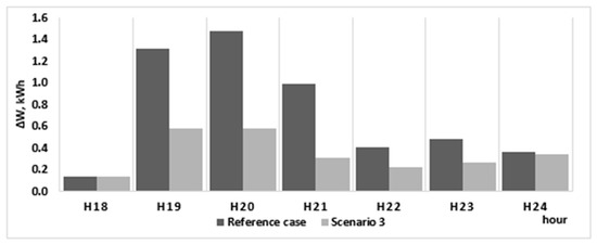 Because of the higher amount of energy used from the batteries, the energy loss reduction was much higher, with the total energy loss in 24 h only being 5.62 kWh, a significant improvement compared to Scenario 1. The loss reduction in the interval 18:01–24:00 is presented in Figure 11, and amounted to 3.02 kWh, the highest value achieved in the three scenarios considered in the paper. By optimally distributing the use of storage on different buses and phases, the effect is maximized.