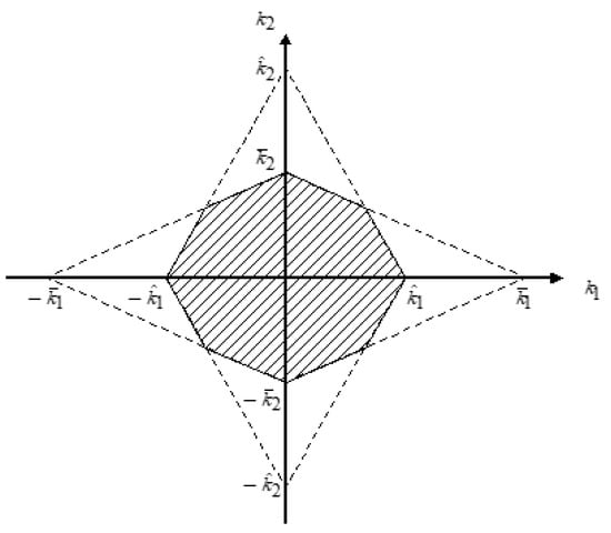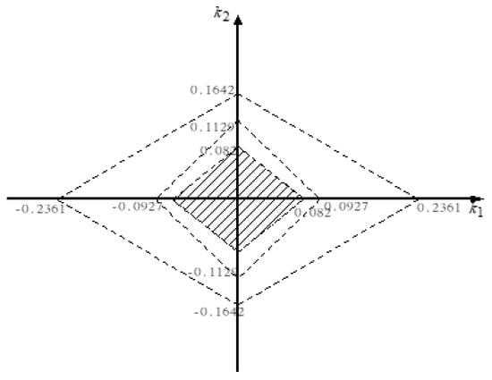 where k1 and k2 are selected inside the admissible region of the convex polygon as shown in Figure 3. Whereas the result of [] promises the stability for ε∈(0, 1) only.