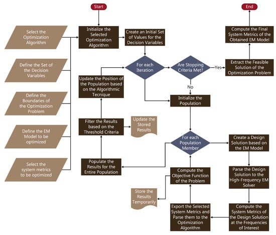 The optimization process is concluded when the stopping criteria are met, i.e., when the number of maximum iterations or maximum function evaluations is achieved or the system metrics values are satisfied [,,]. As a result, the feasible solution of the optimization problem is extracted and the final design of the EM structure is obtained. Based on the final design, a set of system metrics (optimized and/or not) is computed to obtain the final results of the proposed EM structure geometry.