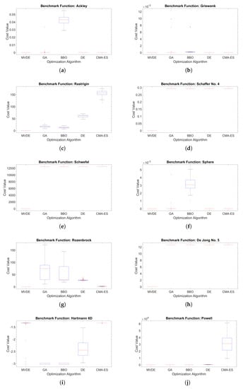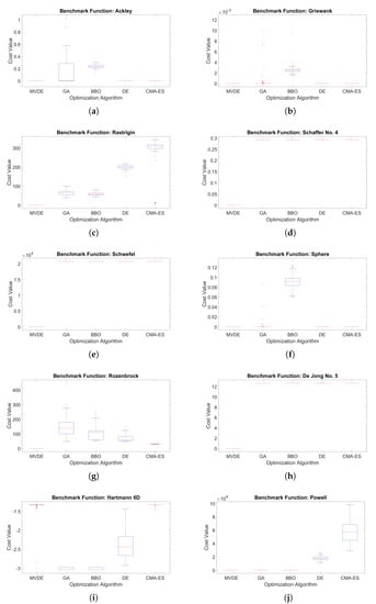 Distribution of the computed results (cost function values for 100 independent trials of the selected benchmark functions) for the MVDE algorithm [] in conjunction with the four popular evolutionary algorithms (GA [,], BBO [], DE [], and CMA-ES []) and for D = 30 (a) Ackley, (b) Griewank, (c) Rastrigin, (d) Schaffer No. 4, (e) Schwefel, (f) Sphere, (g) Rozenbrock, (h) De Jong No. 5, (i) Hartmann 6D, and (j) Powell.
