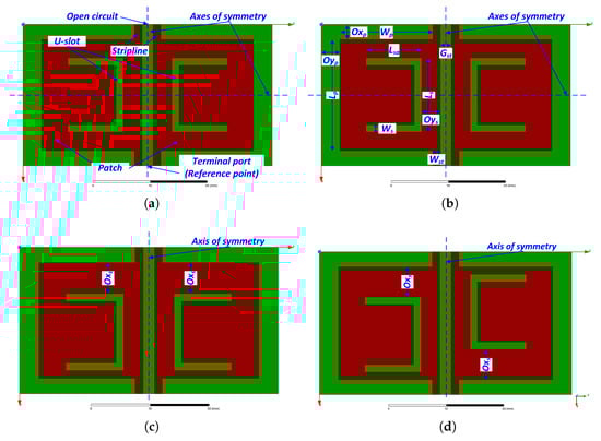 Based on the absorber of Figure 5a, three use cases of the proposed unit cell are determined and included in the optimization process. These are portrayed in Figure 5b–d. The first use case of the proposed unit cell exhibits two axes of symmetry (axes X and Y of the Figure 5b), where the U-slot is centered along the X-axis. In the second use case, the Y-axis of symmetry is omitted, thus allowing to offset the U-slot within the patch of the absorber, by introducing the decision variable (Figure 5c). The third use case of the proposed unit cell differentiates the starting point of the decision variable that affects the offset of the U-slot (Figure 5d).