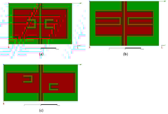 Final geometry of the unit cell uses cases in a FSS structure obtained by applying the proposed design framework. (The final values of the decision variables for each of the unit cell use cases are listed in Table 3. The dark red color denotes the metal surface (copper) of the unit cell; the green color indicates the dielectric substrate (FR-4) of the unit cell.) (a) UC1, (b) UC2, and (c) UC3.