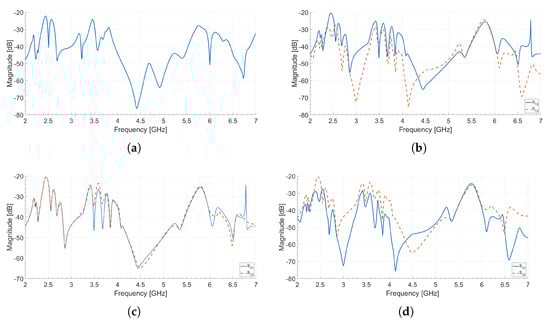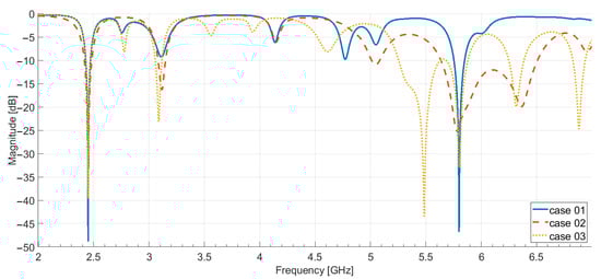 In order to design an FSS structure suitable for RF EH applications, the performance results of the unit cell use cases should be assessed. Figure 7 displays the comparative results of the magnitude of the reflection coefficient (final values of the system metric extracted from the obtained EM model using the proposed design framework and the optimization process of Figure 2) for each of the unit cell use cases. From the presented results, we can conclude that the first use case of the unit cell design achieves the best performance in terms of its reflection coefficient. In detail, the magnitude of the reflection coefficient is −48.78 dB at 2.45 GHz and −46.71 dB at 5.8 GHz for the first use case, −34.90 dB at 2.45 GHz and −25.24 dB at 5.78 GHz for the second use case, and −39.52 at 2.45 GHz, and −32.88 dB at 5.8 GHz for the third use case.