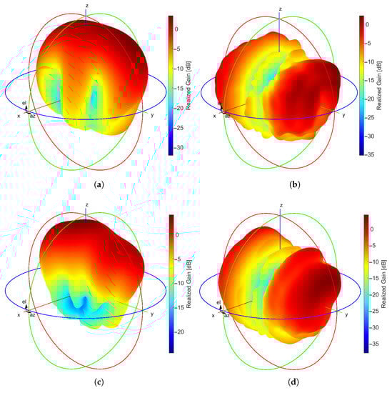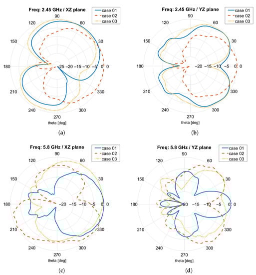Figure 9 depicts the comparative results of the radiation pattern at the XZ and YZ planes of interest for each of the unit cell use cases. From the depicted results, we can deduce that the first and the third use cases of the unit cell exhibit the best performance in terms of its beamwidth operation. For example, both the first and the third use cases achieve a half-power bandwidth (HPBW) larger than 105 deg for the XZ plane and at the frequency band of 2.45 GHz (the corresponding HPBW of the second use case is smaller than 100 deg). Consecutively, the HPBW for the first and the third use cases is larger than 90 deg for the XZ plane and the frequency band of 5.8 GHz, whereas the second use case achieves an HPBW of less than 55 deg for the same main plane and frequency band, respectively.