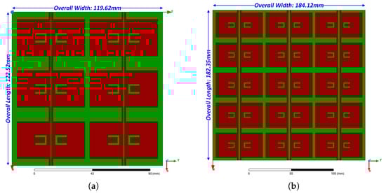 Figure 10 illustrates two representative designed and optimized solutions of an FSS structure based on the design, optimization, and the comparative results of the first of the unit cell use cases presented in Section 3.2. The first one (Figure 10a) is an FSS structure of 3 × 2 unit cells, whereas the second solution (Figure 10b) consists of 5 × 3 unit cells. Such a design, operating in the ISM frequency bands of 2.45 GHz and 5.8 GHz, and having a relatively small size, makes it a strong candidate for a receiving module in practical indoor RF EH applications.