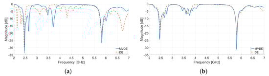Comparative results of the magnitude of the parameter as a function of frequency by applying the proposed design framework in a separate optimization process including the MVDE and the legacy DE algorithm (a) parameter for the 3 × 2 FSS structure and (b) parameter for the 5 × 3 FSS structure.