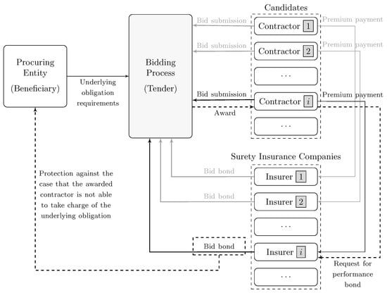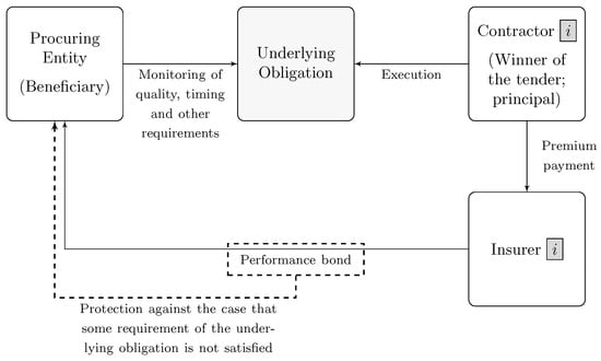 A procuring entity requires a generic “performance”, such as constructing infrastructures or supplying specific goods or services. Hence, the entity mentioned above uses a bidding process to select the best contractor for the assignment. Each contractor interested in submitting the bid has to underwrite a bid bond that guarantees the procuring entity against the case that the awarded contractor is not able to take charge of the required performance. Indeed, the contractor could go bankrupt during the bidding process, or some requirement necessary to fulfill the obligation could not be met (e.g., legal authorizations needed to perform the underlying task). In this case, the bidding process has to be reopened, and the insurer indemnifies the procuring entity.