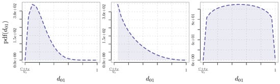 where is the breach/default probability of the contractor over the execution period, and thus, is the expected loss contribution. Indeed, is the loss given default mitigation coefficient. It considers both the expected recovery of the surety from the contractor after the claim and the possible reduction of at the claim time due to the partial fulfillment of the guaranteed obligation. The term is the compensation for the risk aversion of the surety’s stakeholders, where r scales as the cost-of-capital rate. The contract’s price is approximately proportional to the contract’s contribution to the solvency capital requirement (SCR) needed by the insurer to guarantee its solvency in the Solvency II Standard Formula framework. Moreover, the surety’s costs are assumed to be proportional to and are taken into account by the cost ratio s term. The discount contribution of non-zero risk-free interest rates is neglected. As discussed in Section 2, it holds