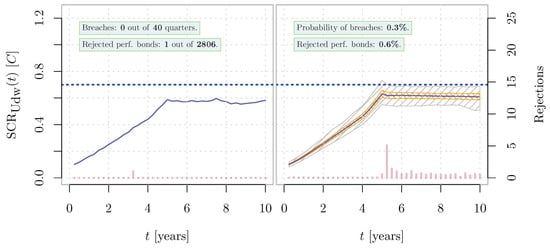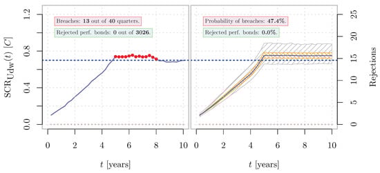 Dynamics of . Left panel: example of Monte Carlo simulation (single scenario), where the horizontal dashed line represents the threshold that is fixed in the RAF, while red dots correspond to the simulated breaches of above the level. Red columns at 0 level (right y-axis scale) represent the count of rejected performance bonds per quarter (zero since no management action is taken). Right panel: simulated distribution of ( Monte Carlo scenarios). The median (solid line), 0.25–0.75 quantiles (orange area), and 0.01–0.99 quantiles (grey area) are plotted. Red columns at 0 level (right y-axis scale) represent the average number of rejected performance bonds per quarter.