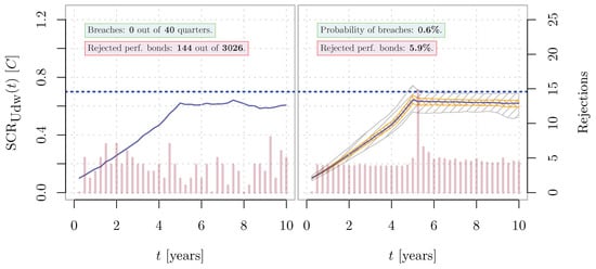 Namely, when the last measure done until t is far enough from the threshold , we aim not to reject more than of the performance bond requested by the insured bidders who win their respective tenders. In case the distance approaches zero or negative values, the RAF constraint becomes stronger up to blocking the acquisition of new contracts at all, until an acceptable level is restored. Figure 5 shows the effectiveness of this approach. Breaches are observable in tail scenarios, almost only in the region () where the SCR regime is changing from expansion to equilibrium. The small number of breaches and the RAF’s reaction implies a fraction of performance bonds rejected slightly above the target level.