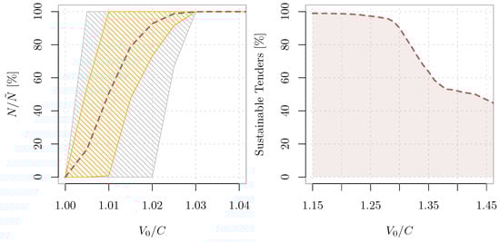 However, unsustainability issues originate from a poor choice of starting price by the public procuring entity. The left panel of Figure 7 shows how a starting price near the breakeven level (i.e., ) disincentivizes constructors to join the bid due to the constraints introduced in condition (8). It is worth noticing that this result is independent of the assumption made about the dependency . A tender that does not attract participants is clearly unsustainable from an economic perspective. The resources invested in promoting it are wasted, and the public works cannot be executed. Further, the opposite case (i.e., ) also implies the economic unsustainability of the tender, as the tender outcome implies and thus an excessive risk for the surety (i.e., an unsustainable cost for the winning bidder or the inability to underwrite the mandatory performance bond). The right panel of Figure 7 shows the results of our simulations in this perspective: the fraction of requests for a performance bond rejected by a given surety increases from ≈0% to ≈50% as passes from ≈1.25 C to ≈1.45 C.