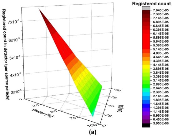Counts under photo peaks of 241Am and 133Ba radioisotopes were recorded in both detectors for various scale layer thicknesses and volume fractions. As an example, ternary surface plots of the recorded counts under the photopeak for the 133Ba radioisotope in the first detector for various combinations of gas, oil, and water volume fractions when the scale thickness is 0 and 2 cm, are shown in Figure 6a,b. Comparing Figure 6a,b, it could be observed that when the scale layer is 0 cm, the sensitivity relative to changes of gas, oil, and water components is much more than when the scale thickness is 2 cm. In other words, by increasing the thickness of the scale layer, somehow, information about the flow inside the pipe starts fading. This exact occurrence has also been observed for the other detector and radioisotope.