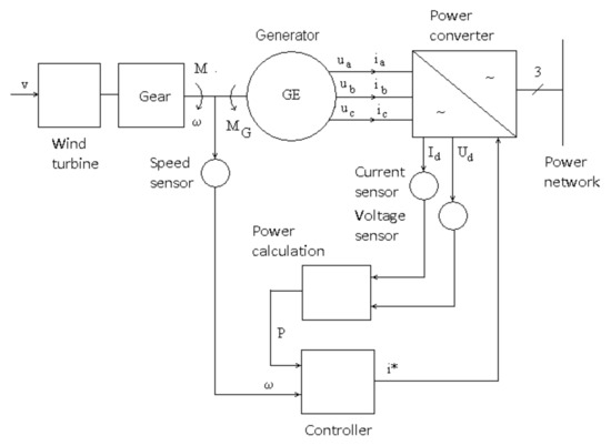 The wind turbine drives through a mechanical gear an electric generator GE, which may be synchronous or asynchronous. The generator supplies the alternating voltages ua,b,c and currents ia,b,c. The alternative voltage is converted by a rectifier in direct voltage Ud, which, in turn, is converted to alternative voltage supplied in the network. The current is controlled to the electronic power converter so that the operating point of the turbine is changed. The current controller works based on the information about the speed ω and power P. The speed ω, voltage Ud, and current Id are measured with sensors. The power is calculated based on the direct voltage and current. The controller sets the current reference i* of the generator load. This is a common control structure, which is used in applications based on maximum power point tracking by adjusting the speed at the turbine axe, controlling the generator with a variable load Id.