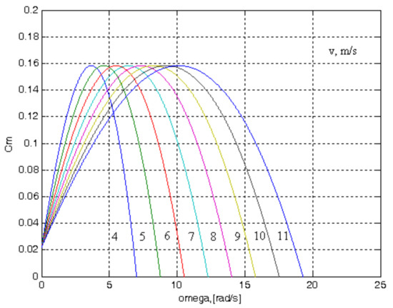 Appendix A. Those characteristics demonstrate that the turbine model behaves according to the presented relations. It is observed that the turbine variable values change with the change in wind speed and load torque. From the presented graphs, it is observed that the operating point of the turbine passes from one characteristic of the speed to another, together with the change in the wind speed and the change in the load torque. This simulation demonstrates that changing the load torque can change the rotational speed, the power generated, and the operating point. If the load torque increases, the operating point tends to move to the maximum power points. The peaks that appear on the characteristics of the variables are due to the sudden changes in the velocity v, which intervene in the calculations at the denominator of the relation of λ. In the condition in which the turbine operates at a low constant load torque, without being driven with maximum power point tracking, the installation reaches a steady state, with operating points far from the maximum power point. This makes it necessary to use methods of maximum power point tracking. The maximum co-ordinate power points (ω,