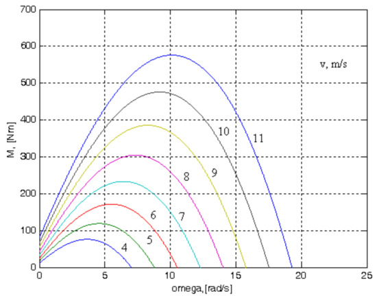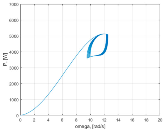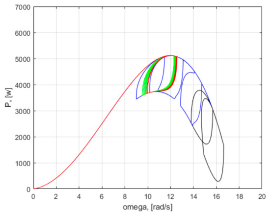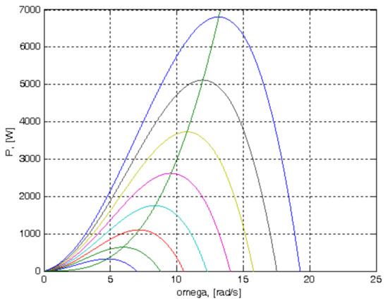 Figure 7 presents the characteristic of maximum power as a function of speed, superimposed over the characteristics of power–speed. It is observed that this characteristic passes through the maximum points.