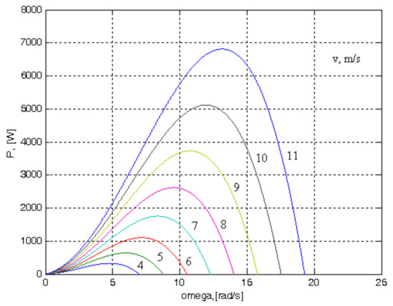 v, which is in accordance with the other characteristics. The torque has non-zero values for zero speed at non-zero wind values. The developed torque increases as the wind speed increases, which also allows the rotation speed to increase. It is observed that the maximum power depends on the rotation speed and the wind speed, which is in accordance with the other characteristics. The power has the value zero for zero speed, corresponding to the relation (4). The power developed increases as the wind speed increases, which also allows the speed of rotation to increase.