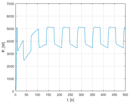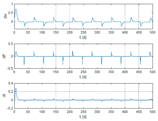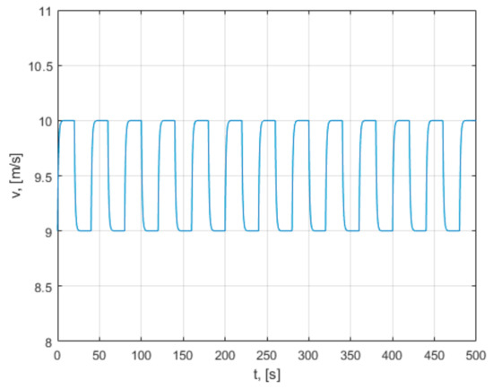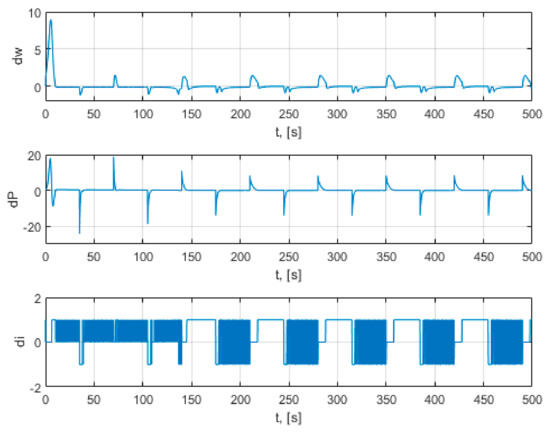 The variables at the controller inputs have continuous values over time. The variable at the output of the regulator is in the form of a three-state pulse train. In the case of on–off control, in the first phase, in a transient state, the trajectories are further away from the optimal trajectory. The transient state lasts longer than in the case of the other two methods. It is observed that, in steady state, the operating point approaches the maximum. The operating point moves between the characteristics of 9 and 10 m/s.