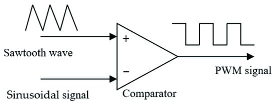 The PWM signal is normally obtained, as in Figure 2. To get a PWM signal, we need two signals of different shapes and frequencies. The first signal is a sinusoidal signal and the second is, for example, a sawtooth signal. The latter has a frequency greater than the sinusoidal signal. In addition, we need a comparator to compare these two signs. The comparator compares the two signals and generates a PWM signal as its output waveform. If the value of the sawtooth signal is greater than the PWM signal, the PWM output signal is in the “high” state, otherwise, it is in the “low” state. Therefore, the value of the input signal amplitude determines the output of the comparator, which defines the pulse width generated at the output [49]. Traditional PWM technology has many advantages compared with other modulation strategies used in AC machines. For example, the PWM technology is simple, provides accuracy and fast response time. It provides a high input power factor, low initial cost, and is easy to implement. The PWM strategy can help the motor to produce maximum torque even at low speeds. However, the PWM technology has the following disadvantages. Due to the high PWM frequency, the switching loss is quite high. It can cause radio frequency interference. This strategy provides a high THD value for the current [49]. In [50], the author proposed to apply PWM technology and neural algorithms to wind turbines based on DFIG. In [51], a three-level PWM technology based on fuzzy logic controllers is proposed. The designed modulation strategy can achieve a fast transient response, while the THD of the output voltage is very low during steady-state operation.