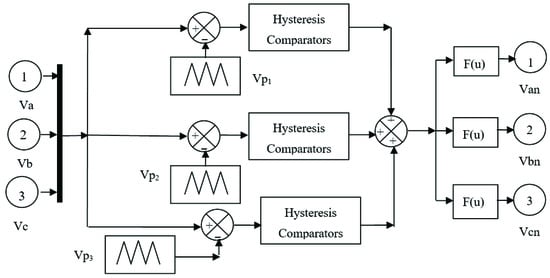 In this work, we use the four-level PWM method to command the converter of the DFIG-based DRWT systems. Figure 3 shows the structure of the four-level PWM method. In a four-level PWM strategy, three-phase voltages are compared with three sawtooth waves.Three comparators are used In a four-level PWM strategy to generates a PWM signal. The structure of the hysteresis comparators of the four-level PWM technique is shown in Figure 4. Comparing with the space vector modulation technique, the four-level PWM strategy is a simple algorithm, gives fewer current ripples, easy to implement, fast response time, and is less dependent on DFIG-DRWP parameters. But the four-level strategy generates a variable-frequency control signal.
