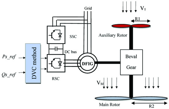 The DRWP system is a wind turbine for solving both problems that are based on a single rotor WT (SRWT). The DRWP uses two wind turbines rotating in opposite directions on the same axis. However, the SRWT system is the most common WT used the generates electrical energy. The mathematical model of the DRWP is different from the SRWT system. The DRWP system has been proposed as new wind power, as shown in Figure 7. The DRWP system gives more power coefficient and aerodynamic torque compared to the SRWT system. The DRWP system design is composed of two wind turbines, the main turbine and the auxiliary turbine [56]. The control of the DRWP system is difficult compared to the SRWT system. The total aerodynamic power of the DRWP system is the auxiliary turbine power (PA) add to the main turbine power (PM) as shown by the following equation: