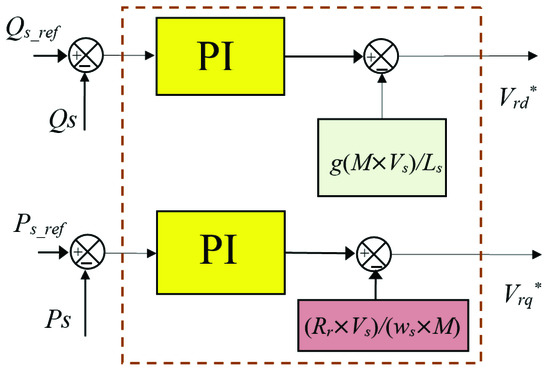 Starting from Equations (15) to (22), we can give a figure by which we explain the principle of operation of the DVC method. Figure 8 shows the structure of the traditional DVC technique. The objective of this method is to obtain the reference rotor voltages (Vrd* and Vrq*) from the active and reactive power errors by using two PI controllers.