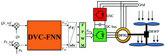 The neural DVC method (NDVC) with the five-level FPWM technique has been designed as a novel design for the improvement of current output, reactive and active power ripples, as shown in Figure 10. The objective of this proposed method is to obtain high quality Vrd* and Vrq* from active and reactive power errors. In this method, the direct and quadrature rotor voltages (Vrd* and Vrq*) are regulated by the neural networks (see Figure 11). From the observation of Figure 11, we find that the values of both Vrd* and Vrq* are related to neural networks, in contrast to the classical method, with the aim of obtaining Vrd* and Vrq* of high quality, thus reducing generator maintenance and extending the life of the inverter.