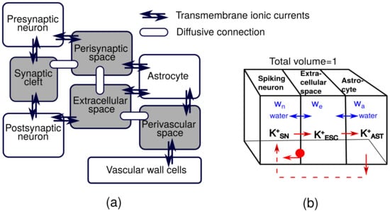 In the detailed model of a neurovascular unit, the extracellular space is divided into several parts of various sizes, as shown in Figure 1a. The synaptic connection of two neurons occurs through a narrow synaptic cleft surrounded by the perisynaptic space, which, in turn, is part of the common extracellular space (ECS). The vascular wall cells are surrounded by a relatively isolated perivascular space, which is connected to the ECS by small (about 20 nm) gaps between the astrocytic endfeet.