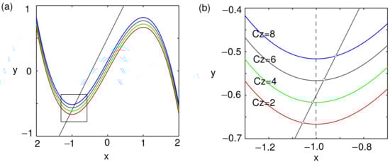 Figure 2 explains the selection of parameters and the action of using the nullcline crafting. Separate fulfillment of the conditions and gives two curves, the relative position and points of intersection of which give information about the dynamics on the [27] phase plane. For the selected parameter values (shown in the table below), there is a single nullcline intersection and therefore a single equilibrium state. This equilibrium state is stable if the intersection point is located to the left of the minimum of the x -nullcline, which has the shape of a cubic parabola. In our model, this condition is satisfied for small values of , which is clearly seen in Figure 2b. As grows, the equilibrium point loses stability, and the neuron model goes into a spontaneous oscillation mode. This is very similar to the response of a real neuron to an increase in the extracellular potassium concentration [14]. We use this analogy in our model.