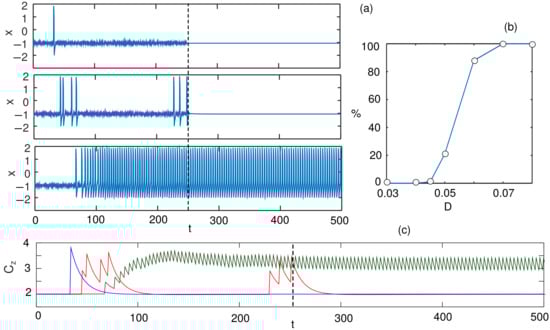 Figure 3b shows an estimate of the neuron probability to enter this state depending on the intensity of the noise. This estimate was obtained based on a series of 100 runs of the program for each value of D and counting those cases where fluctuations persisted after turning off the noise. As one can see, as the noise increases, and the system completely goes into self-sustained mode. Note that if this were just a noise-induced system switching between two states, the probability of cessation of activity after turning off the noise would not become zero. However, the variable z of the model tends to accumulate with each spike, providing positive feedback, supporting further firing. This can be clearly seen in Figure 3b, where time courses of z for all three cases are shown together.