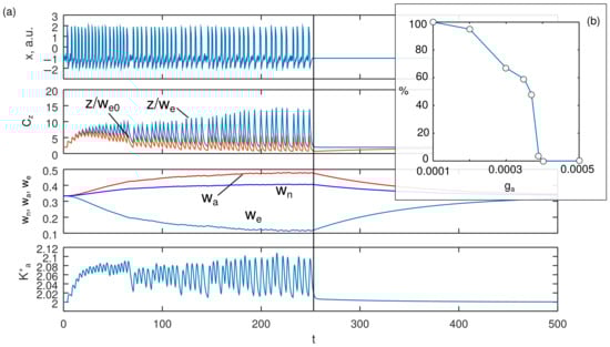 Further, we increased the contribution of the astrocyte by increasing the parameters , at , for which the self-sustained dynamics was 100%, having also performed 100 program runs for each value of . As one can see in Figure 4b, even small values of the block self-sustained firing, returning stability to the excitable mode.