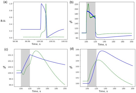 In this section, we present the results of the model adjustment for the results of a specific simulation run of the large model. We compare variable time courses obtained from both models by presenting them as a percentage of change from the initial level (for volumes and concentrations) or by comparing the shape (for neural spikes). Specifically, we compared the results for two cases—(i) stimulation with current from the 100th second to the first spike (Figure 5a); (ii) stimulation with an external current from 100 to 120 s (highlighted in gray in the figure plots (Figure 5b–d).