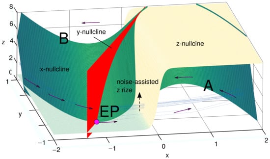 These surfaces are shown in Figure 6. Here, the equilibrium state EP is represented by a magenta-filled point located at the intersection of all three planes. Region A, corresponding to the growth of z, is located under the light shaded part of the z-nullcline. In region B, z decreases with time. In the location of the x and y nullcline, one can recognize the analogy with Figure 2.