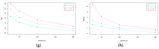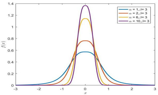 As is shown in the following two pictures (Figure 1 and Figure 2), two shape parameters ( and ) have a decisive effect on the shape of the density function. The density function has a heavier tail with a smaller value of and , but it is the opposite when the parameters and are larger. Furthermore, the shape parameter plays a decisive role in the shape of the distribution and the change of parameter can control the tail behavior.