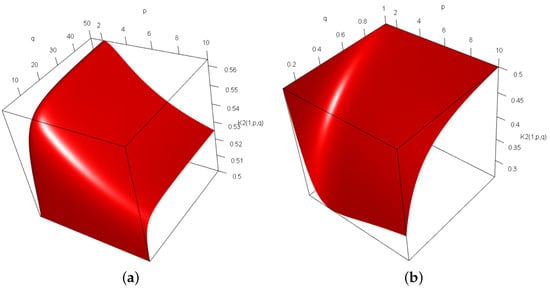 Since the value of has little effect on the value of and , we may assume that . On the one hand, it is not very difficult to prove that, for a fixed , decreases monotonically with respect to . Then we have: . For , the interval of the shape parameters are (1, 10) and (0.1, 50), respectively. The reason for choosing these two ranges is that they include possible values for parameters in practical applications. From Figure 3, we can obviously find that the range of function is never greater than 1. This means that we can only adjust the parameter to make the pdf of the Gt distribution have a steeper shape. On the other hand, for fixed and p, when , both and tend to 0 but has a faster convergence. This means that the pdf of the new Gt distribution proposed by us has a heavier tail when the parameters are within a reasonable range. Thus, the conclusion stated in the preceding paragraph is therefore self-evident.
