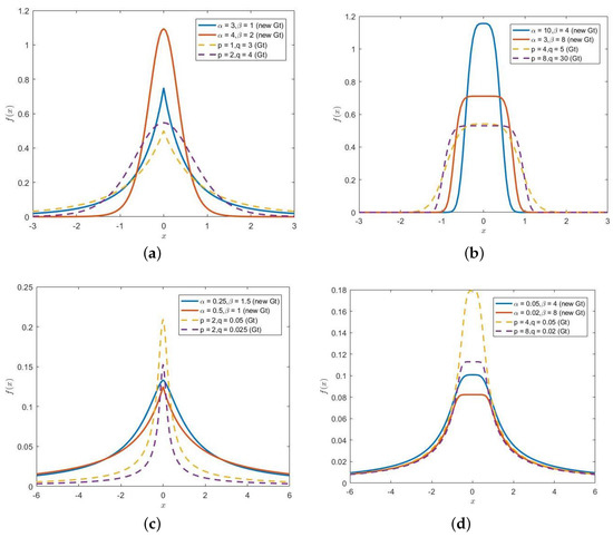 The pdf generated under different shape parameters can be divided into four categories according to different shapes and the tail behavior, i.e., steep in shape and with a light tail, flat in shape and with a light tail, steep in shape and with a heavy tail, flat in shape and with a heavy tail. As is depicted in Figure 4, the solid line denotes the new Gt distribution, and the dashed line represents the previous Gt distribution defined by McDonald and Newey (1988) [1]. The subfigure Figure 4a–d depicts the pdf of the Gt distribution and the new Gt distribution under the above four categories with different shape parameters, respectively. It can be seen from the figure that, if the parameter value is in a reasonable range, the shape of the new Gt distribution is more flexible and more suitable for fitting a wider range of data.